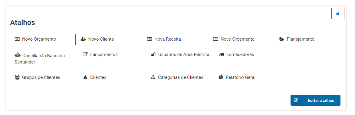 Atalhos: nesse modulo você consegue selecionar atalhos para as abas do sistema que é mais utilizado. Para isso basta clicar em cima do nome da aba que deseja acrescentar ou tirar (para ver mais opções é necessário clicar em “Editar atalhos”).